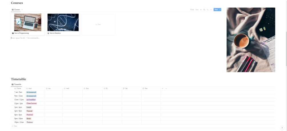 Course Pages (with Readings List & Syllabus): Create dedicated pages for each course, complete with readings lists and syllabi. Organize course materials, track readings, and stay ahead of your coursework.